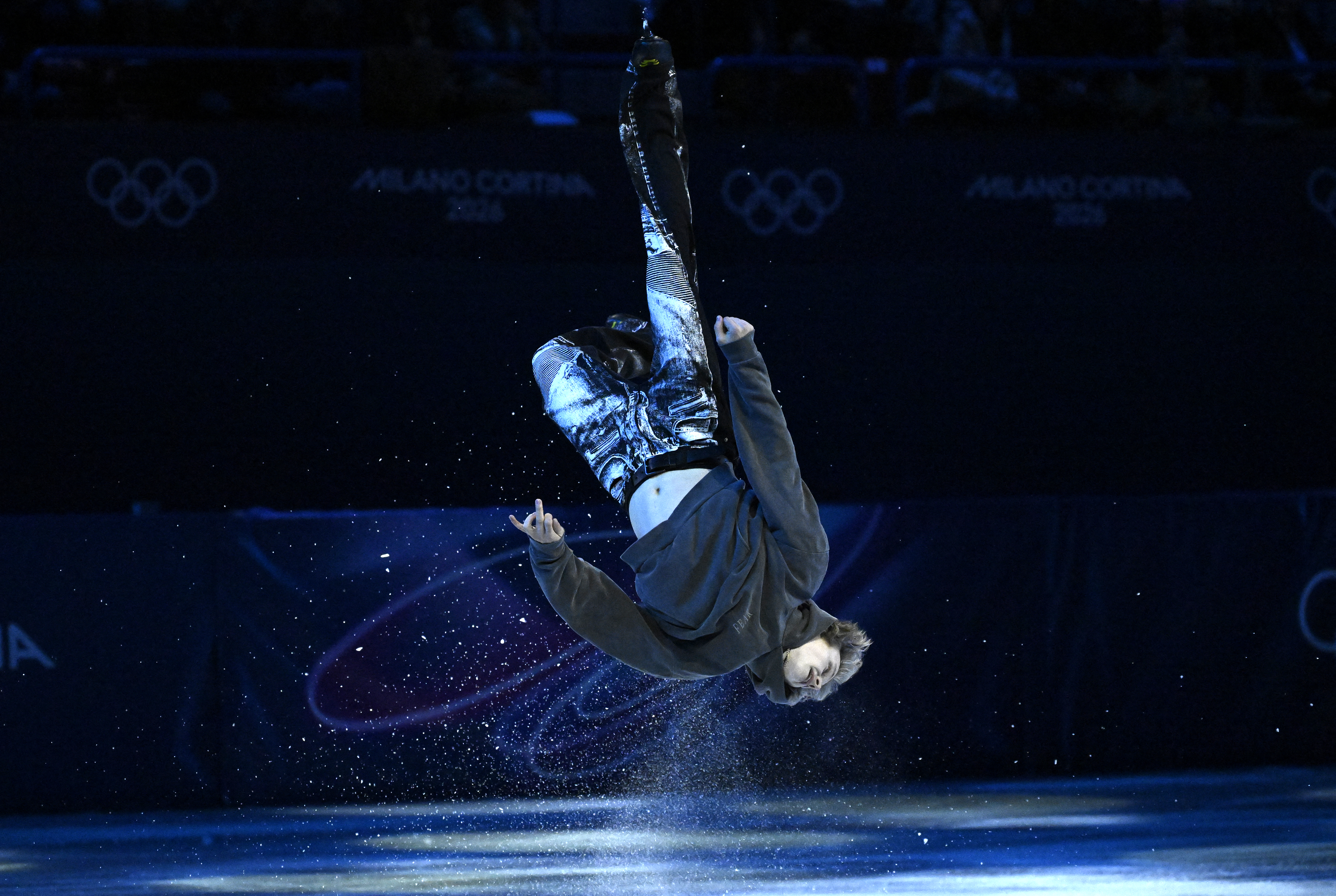 Ilia Malinin the "Quad God" and heavy favorite for men's singles gold at the Milano Cortina 2026 Winter Olympics skated onto the Exhibition Gala stage in Milan wearing a gray hoodie with "FEAR" printed upside down on it. A quadruple jump. His signature backflip. A standing ovation. One of the most emotional moments of the entire 2026 Winter Olympics.